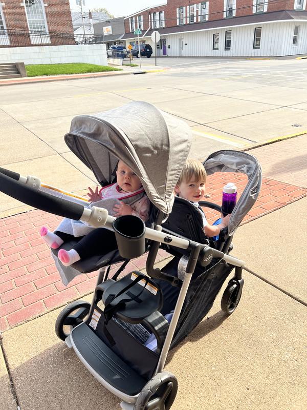 The Graco Ready2Grow 2.0 double stroller is a strong, reliable stroller. It comes with a little cubby space on the bottom area as well as a bench seat for your toddler to ride along with you. The only down sides I see to it are It is a little awkward to open and I wish it had at least two upper cup holders.