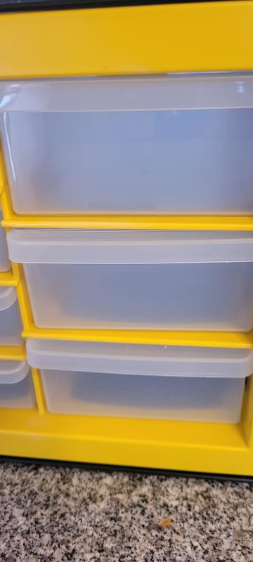This is a great sturdy drawer set that would be perfect for a garage space or craft room. The only thing that I am not a huge fan or is the yellow border around the drawers. It would fit into more spaces if the color was more neutral.