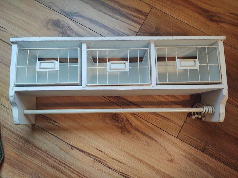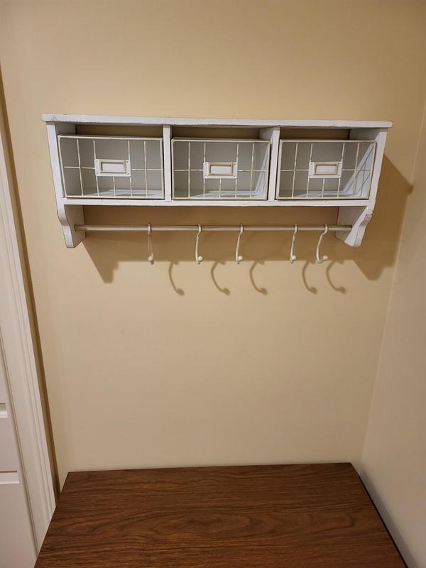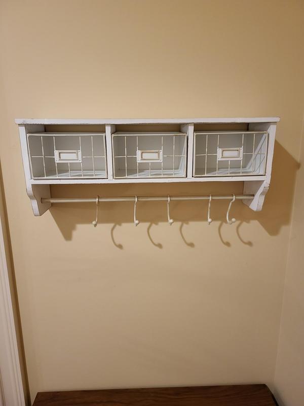 This shelf was a must have for me. It fits perfectly on my wall between door and window. It is sturdy, easy to install, and absolutely perfect. You can remove the bar to remove hooks or to add extras that came with it. The metal box inserts are unique and allow for extra storage space for those spare keys and postage.