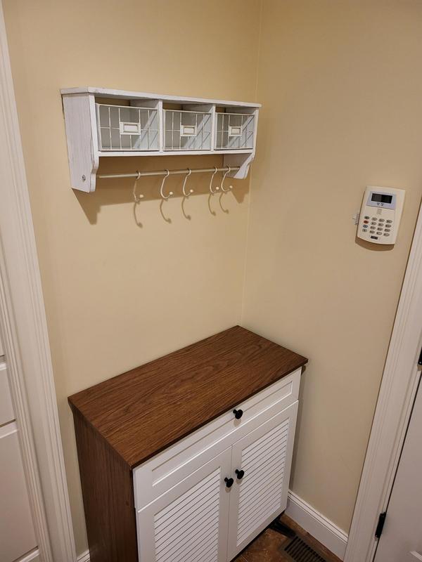 We love this organizer! It looks great in our entrance hallway. It was very easy to hang up and we love all the different hooks and spots to hold things. It has a great color to it and matched perfectly. We are going to get a couple more!