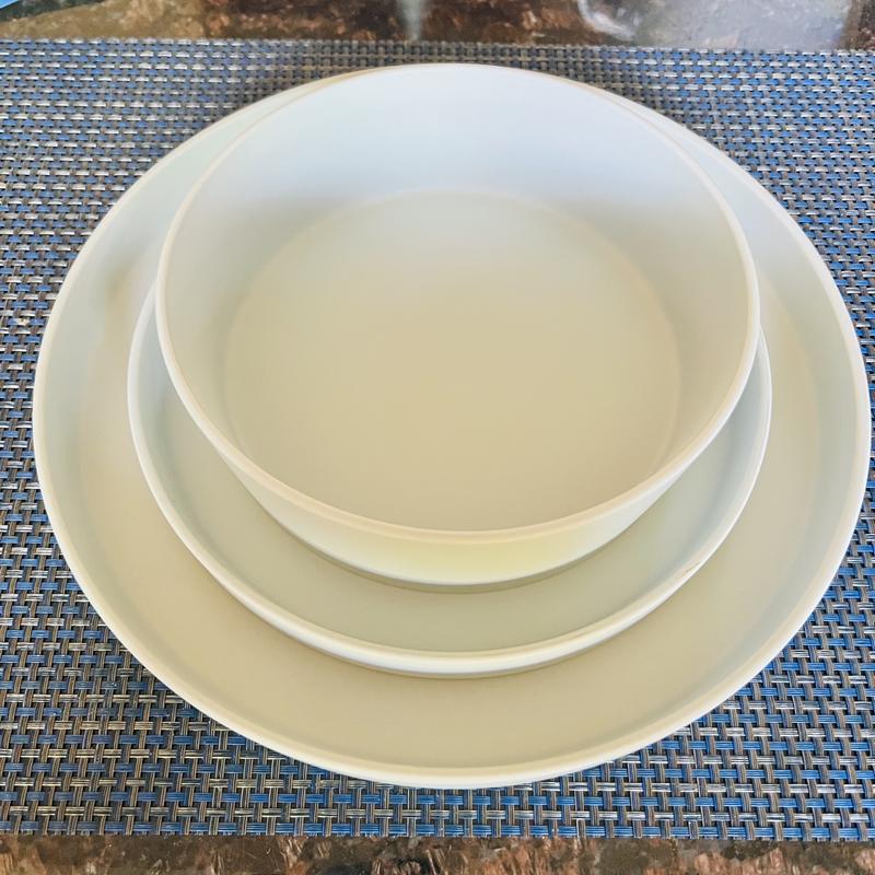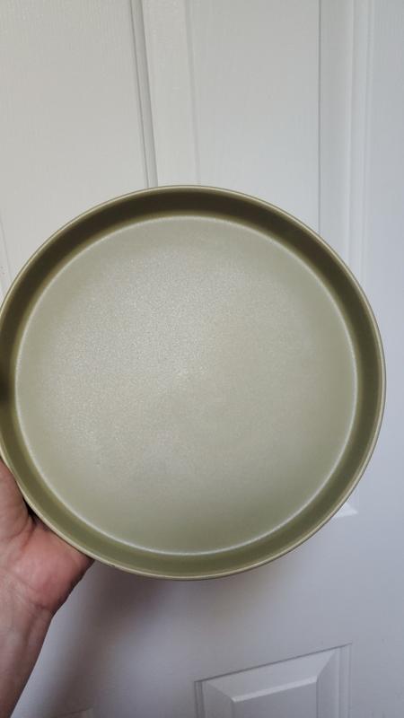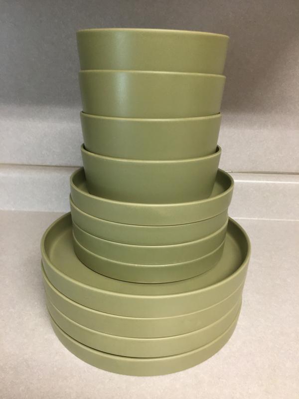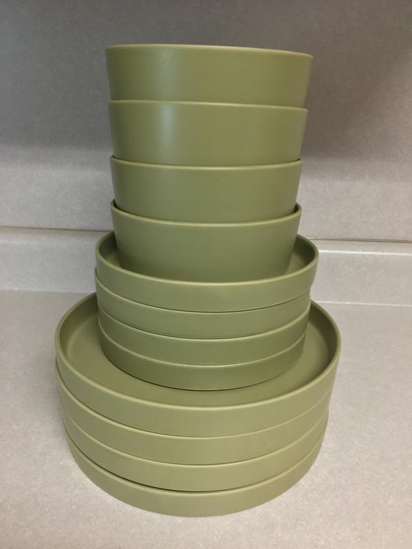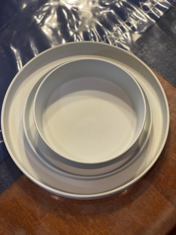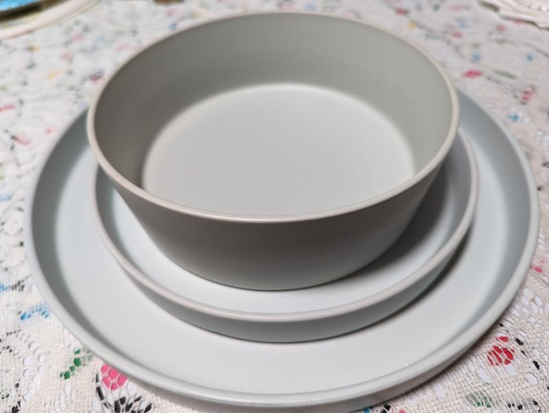 I like the color (light blue-grey) and shape of this dinnerware. The bad side is that they are not stackable. They easily take silverware marks and scratches, even after the first use. Other than that, I like this dinnerware.
